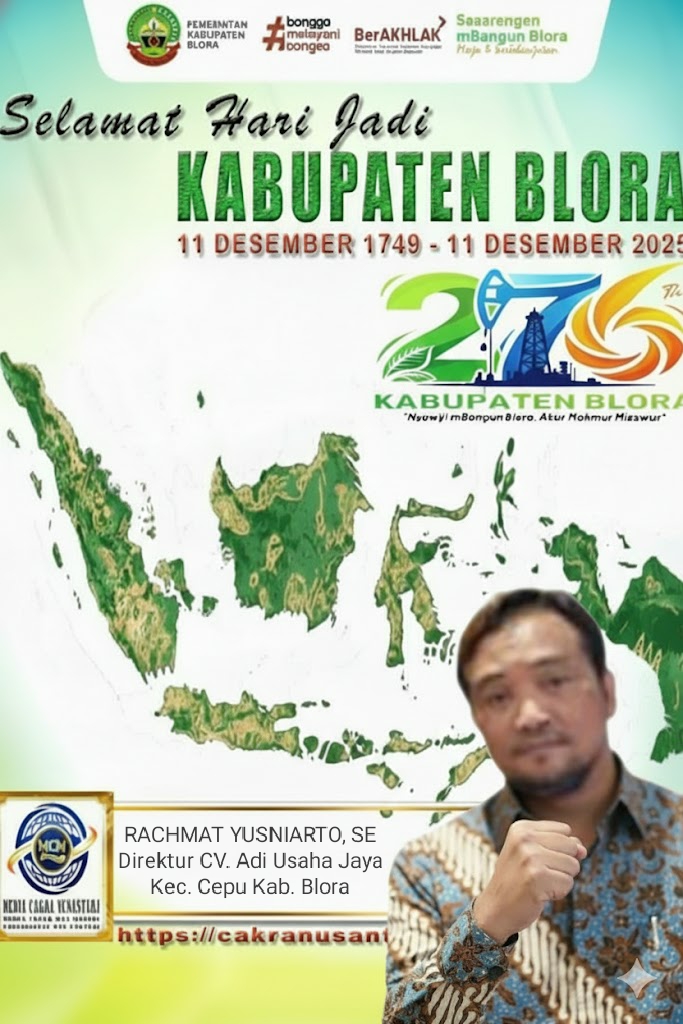 BLORA–MEDIA CAKRA NUSANTARA, – Rachmat Yusniarto, SE, Direktur CV. Adi Usaha Jaya yang beralamat di Jalan Ngaji No. 19, Cepu, Kecamatan Cepu, Kabupaten Blora, turut menyampaikan ucapan selamat Hari Jadi Kabupaten Blora yang ke-276, yang diperingati setiap tanggal 11 Desember (1749–2025). Pada peringatan tahun ini, Blora mengusung tema “Nyawiji Mbangun Blora, Akur Makmur Misuwur.”