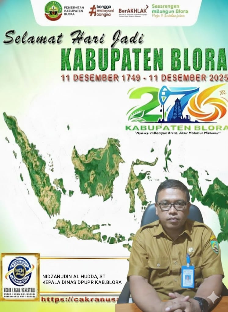 BLORAMEDIA CAKRA NUSANTARA,- Kepala Dinas Pekerjaan Umum dan Penataan Ruang (DPUPR) Kabupaten Blora, Nidzanudin Al Hudda, ST. menyampaikan dukungan penuh atas peringatan Hari Jadi Kabupaten Blora ke-276 yang jatuh pada 11 Desember 2025. Dengan mengusung tema “Nyawiji Mbangun Blora, Akur Makmur Misuwur”, peringatan tahun ini diharapkan menjadi momentum memperkuat kebersamaan dalam membangun daerah.