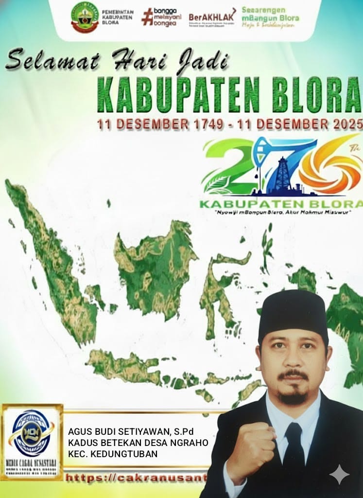 BLORA – MEDIA CAKRA NUSANTARA,- Agus Budi Setiyawan, S.Pd, Kepala Dusun (Kadus) Betekan, Desa Ngraho, Kecamatan Kedungtuban, turut mengucapkan selamat Hari Jadi Kabupaten Blora yang ke-276, yang diperingati pada 11 Desember 2025. Hari jadi tahun ini mengusung tema “Nyawiji Mbangun Blora, Akur Makmur Misuwur”, sebagai semangat kebersamaan dalam membangun daerah.