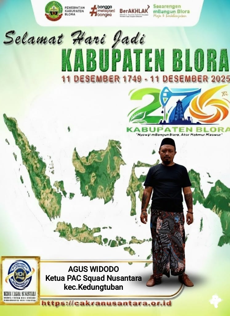 BLORA–MEDIA CAKRA NUSANTARA, – Agus Widodo, Ketua PAC Squad Nusantara Kedungtuban, turut menyampaikan ucapan selamat Hari Jadi Kabupaten Blora yang ke-276 yang diperingati pada 11 Desember 2025. Dengan mengusung tema “Nyawiji Mbangun Blora, Akur Makmur Misuwur”, peringatan tahun ini diharapkan menjadi momentum memperkuat persatuan seluruh elemen masyarakat.