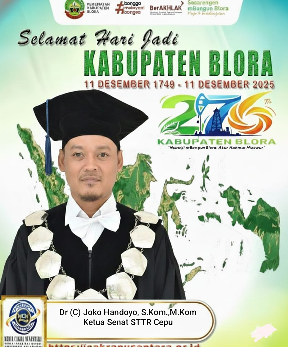 BLORA – MEDIA CAKRA NUSANTARA, – Ketua Senat Sekolah Tinggi Teknologi Ronggolawe (STTR) Cepu, Dr (c) Joko Handoyo, S. Kom., M. Kom, turut menyampaikan ucapan selamat Hari Jadi Kabupaten Blora ke-276 yang diperingati pada 11 Desember 2025. Dengan mengusung tema “Nyawiji Mbangun Blora, Akur Makmur Misuwur”, peringatan tahun ini menjadi momentum penting bagi seluruh elemen masyarakat untuk terus bersinergi membangun Blora.