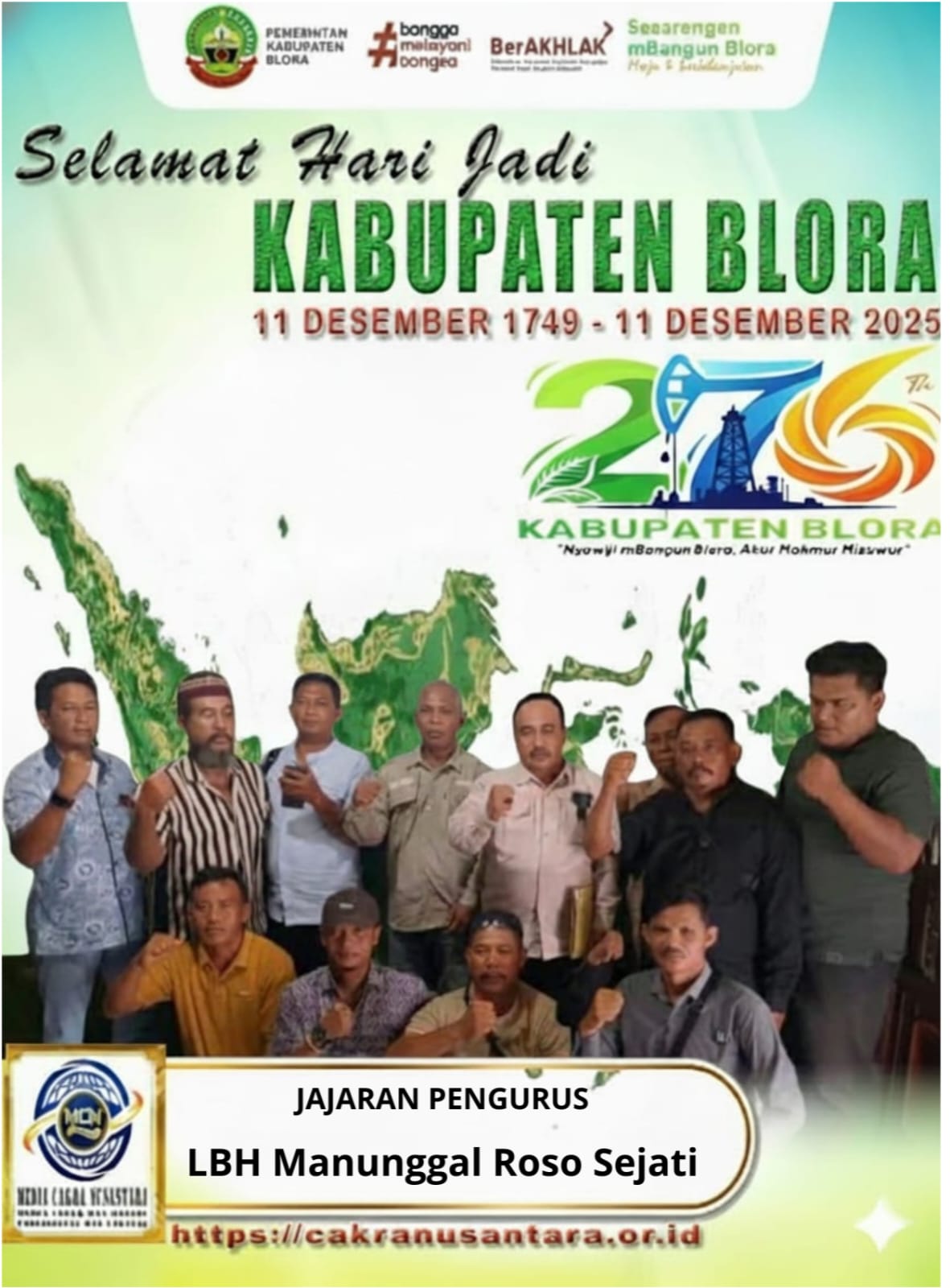 BLORA – MEDIA CAKRA NUSANTARA, – Seluruh jajaran pengurus Lembaga Bantuan Hukum (LBH) Manunggal Roso Sejati yang beralamat di Jalan Plantungan, Desa Ngampel RT 001 RW 003, Kecamatan Blora, Kabupaten Blora, turut menyampaikan ucapan Selamat Hari Jadi Kabupaten Blora ke-276 yang diperingati pada 11 Desember 1749 – 11 Desember 2025.