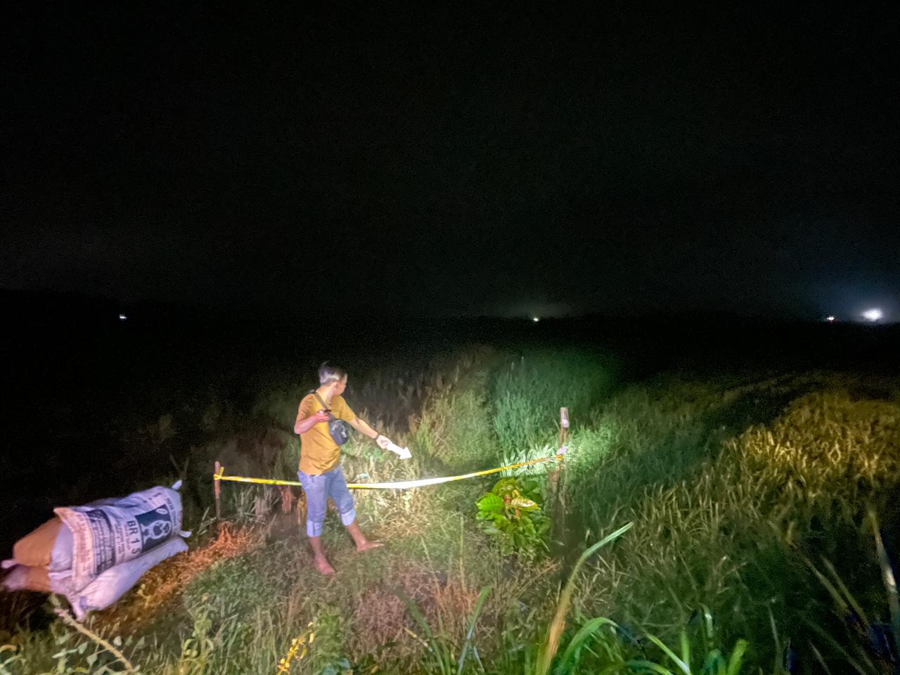 Saat dilakukan pencarian, korban ditemukan dalam posisi terlentang di tepi pematang sawah dan tubuhnya menindih kawat jebakan tikus yang masih terpasang mengelilingi lahan pertanian.